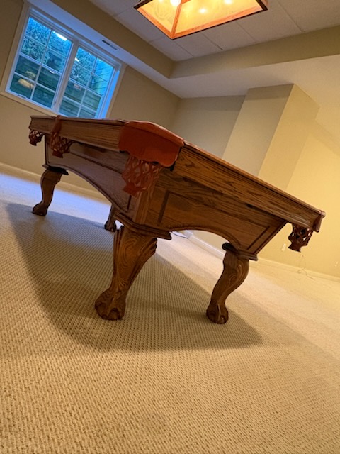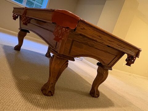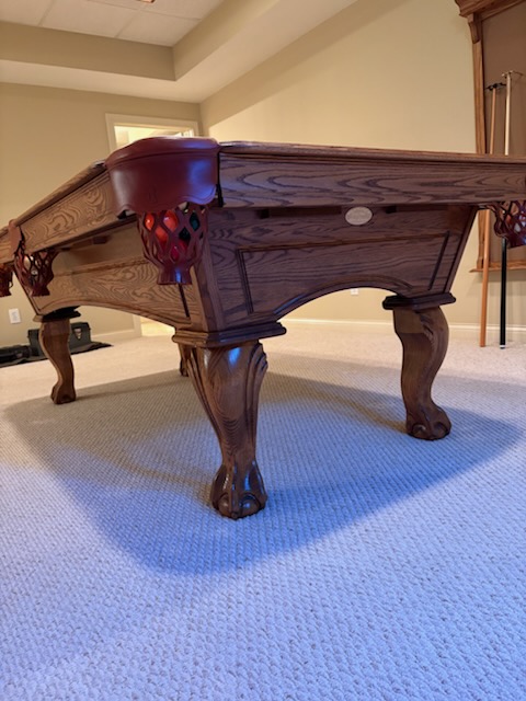 An elegant 7ft Olhausen pool table finished in a gorgeous rich oak stain, featuring beautifully detailed woodwork and classic Ball & Claw legs. This timeless design brings refined character, durability, and smooth, reliable playability to any game room.